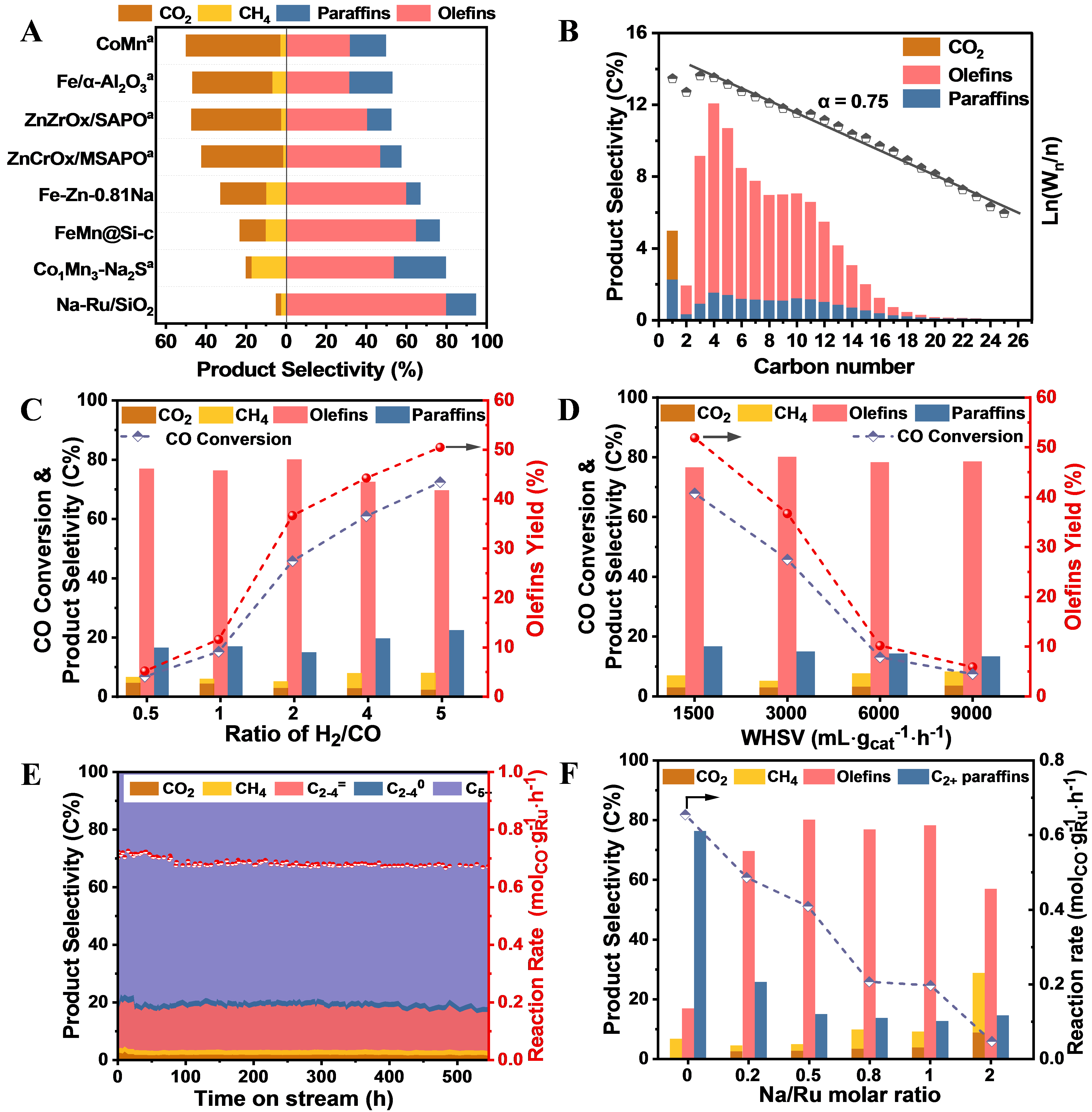 烯烃包括低碳烯烃(C2-4=)和长链α-烯烃(C5+=),是现代化学工业的基本原料和重要中间体,广泛用于塑料、溶剂、润滑油、药物、化妆品等高附加值产品的生产。传统上,长链α-烯烃主要顺利获得石油基乙烯齐聚取得。我国80%以上的C6+长链α-烯烃需要依赖进口。除了石油路线外,非石油含碳资源顺利获得合成气转化也能得到烯烃。近年来,合成气直接制烯烃取得了重大突破(Science, 2012, 335, 835; Science, 2016, 351, 1065; Nature 2016, 538, 84; Science,2021, 371, 610),开展了基于氧化物-分子筛的双功能路线(OX-ZEO)以及基于Fe/Co基的费托合成路线(FTO)。然而,现在所报道的催化体系中,产物中较高的C1副产物(CO2和CH4)选择性(30%~50%)极大降低了反应过程碳利用效率和烯烃收率。此外,较高的CO2选择性也导致后续脱碳、产物分离等过程能耗的增加。在“碳达峰”和“碳中和”的背景下,有必要研制全新的高碳效合成气直接转化制烯烃催化剂,大幅降低C1副产物选择性,实现高活性高选择性获取长链α-烯烃,进一步促进过程的节能减排增效。